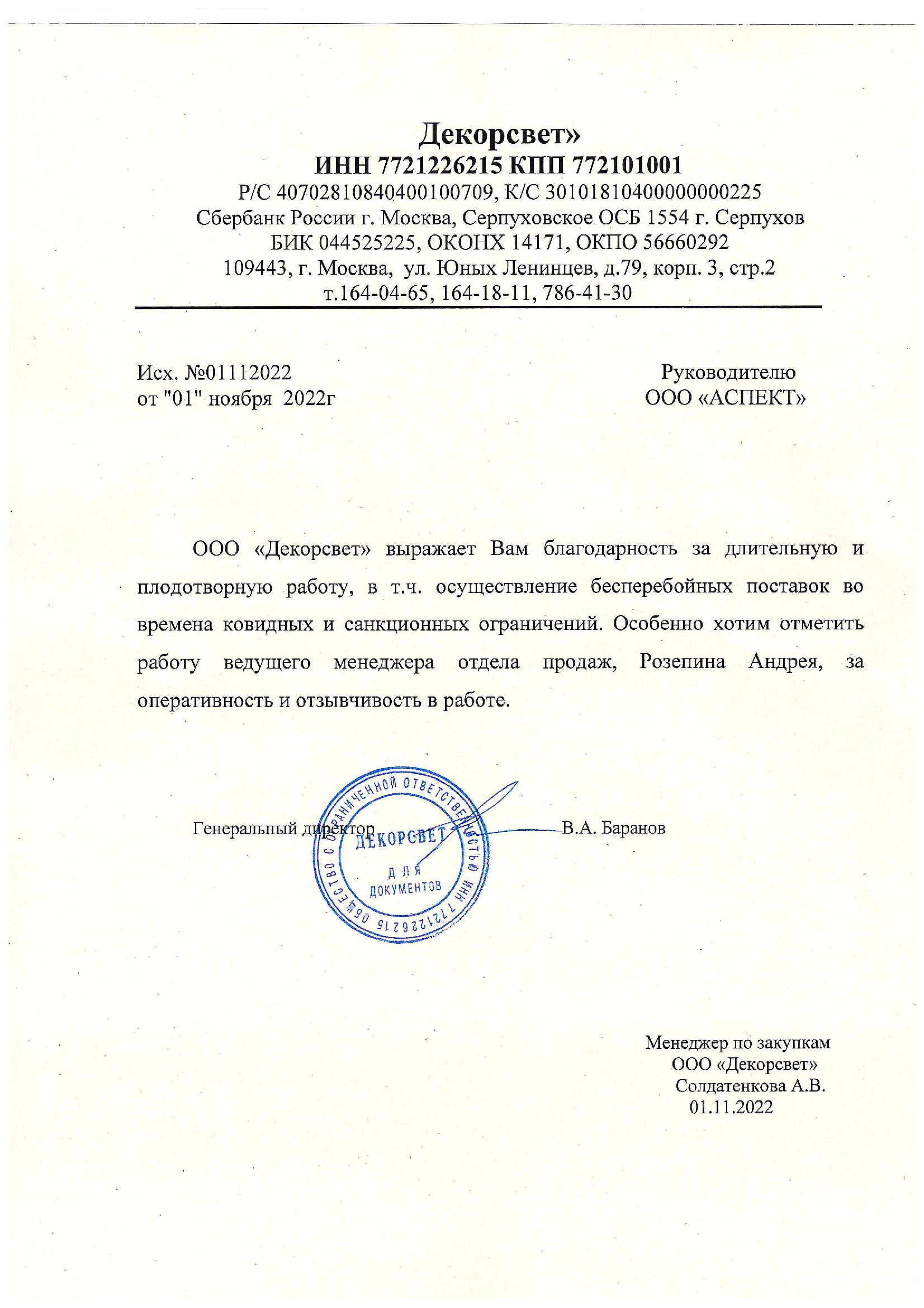 ООО "Декорсвет" выражает Вам благодарность за длительную и плодотворную работу, в т.ч. осуществление бесперебойных поставок во времена ковидных и санкционных ограничений. Особенно хотим отметить работу ведущего менеджера отдела продаж, Розепина Андрея, за оперативность и отзывчивость в работе.